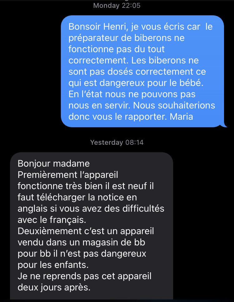Arnaquer un jeune couple en vendant des produits defectueux, quitte à mettre en danger la vie d'un bébé de 2 mois, et refuser de reprendre son objet avec un tel manque de respect mérite au minimum de passer un peu de temps à réaliser une réponse adaptée.